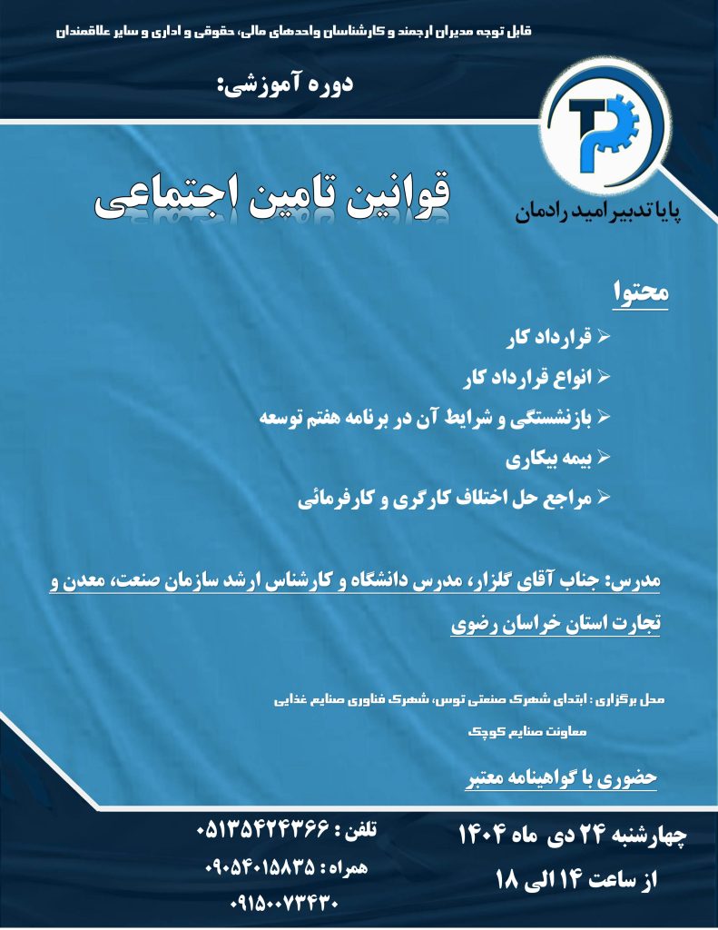 کلیه دوره ها قابلیت برگزاری در محل سازمان متقاضی را دارا می باشند.